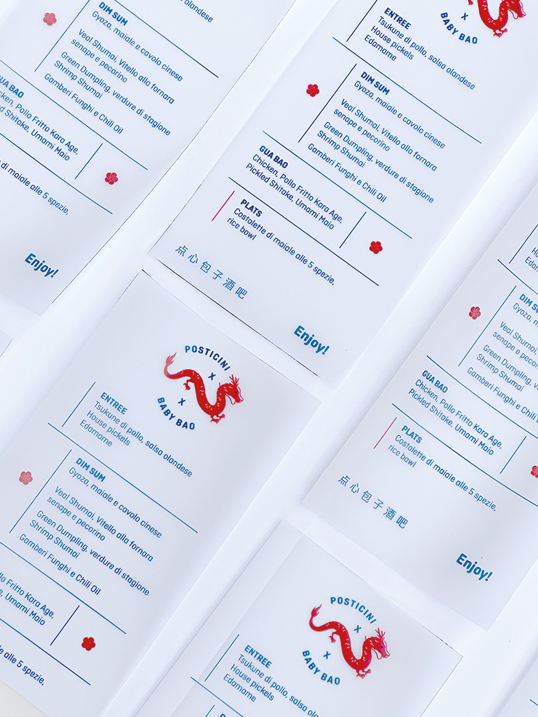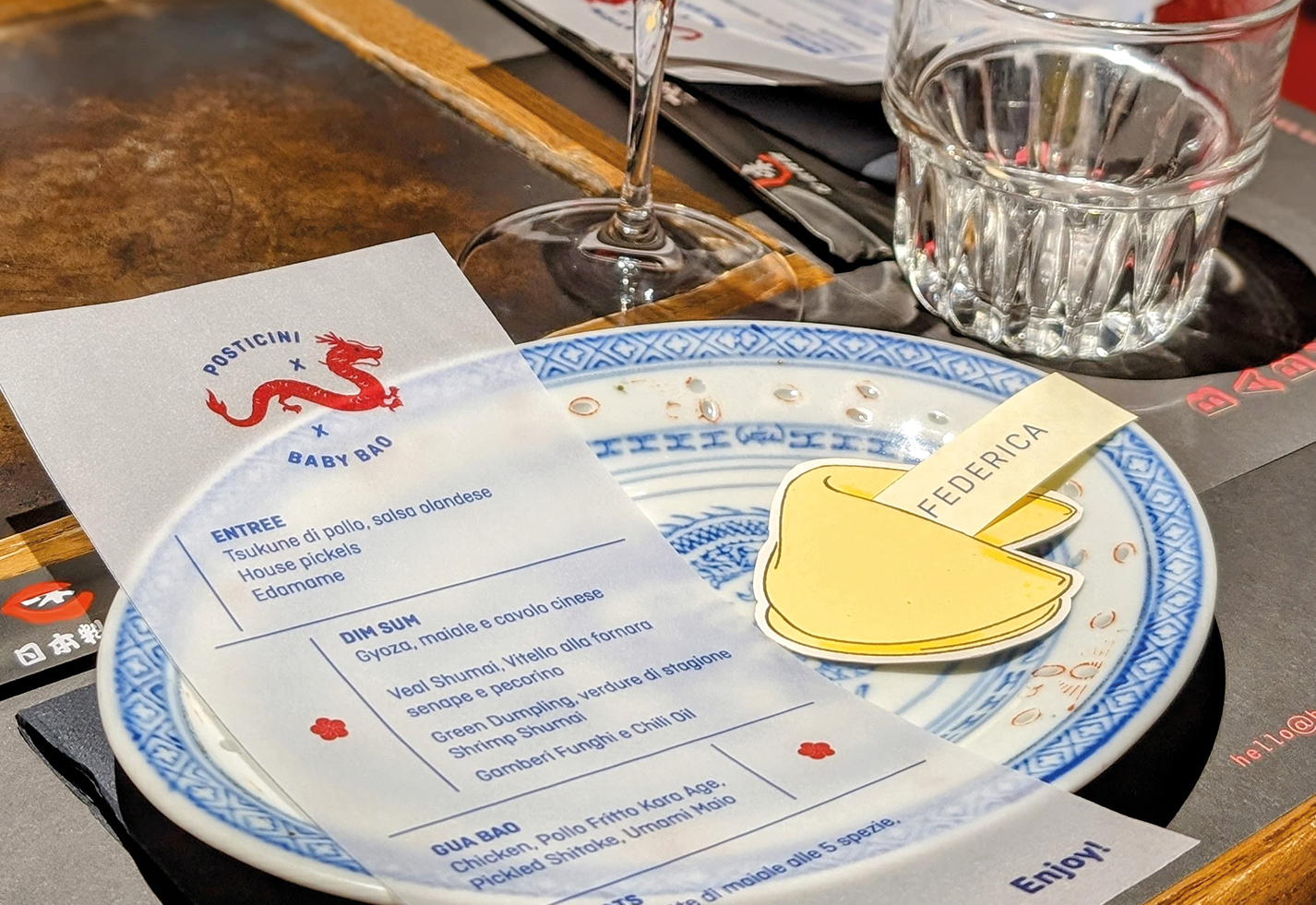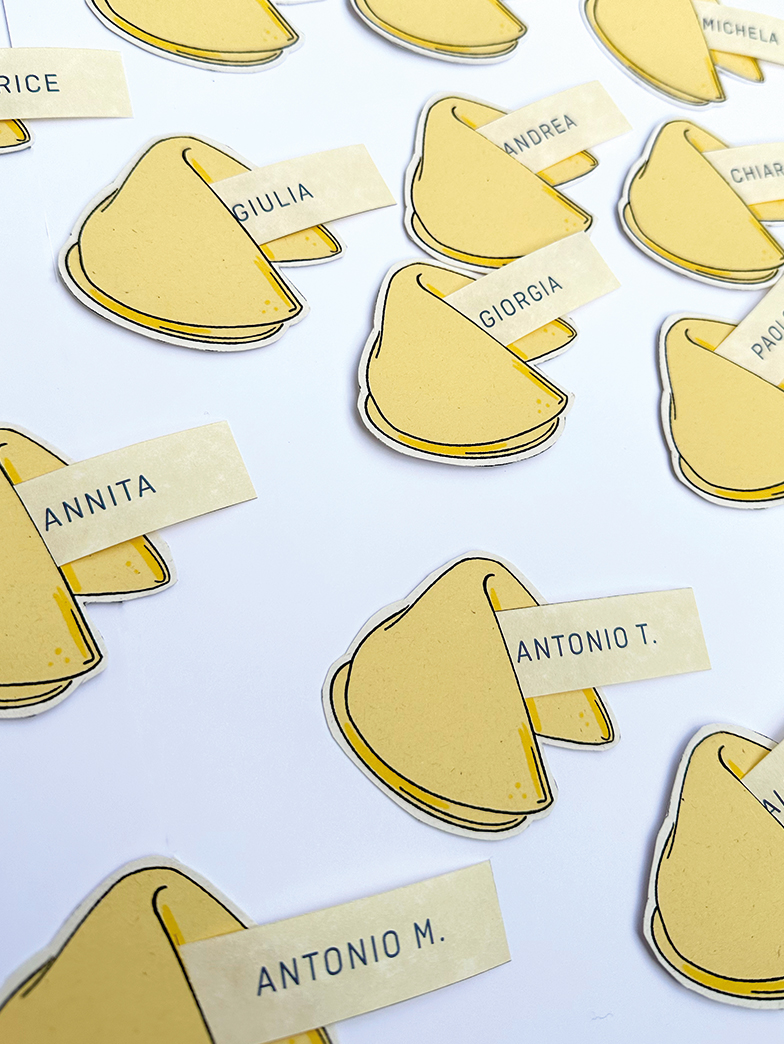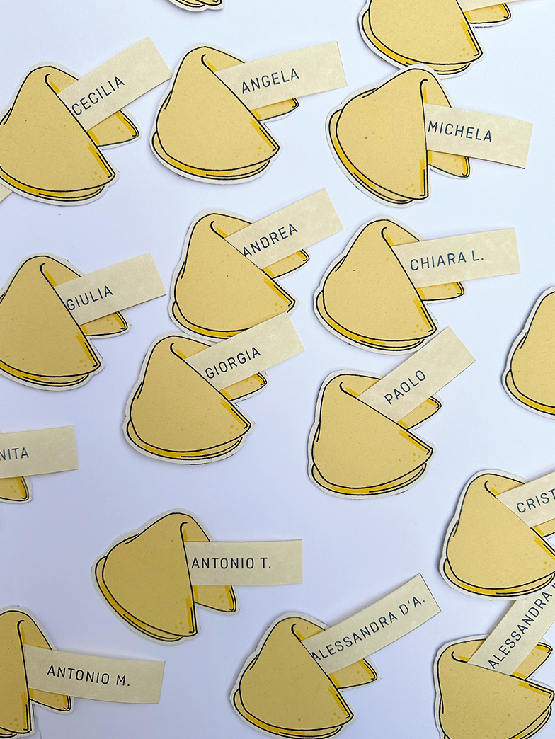 Stationery realizzata per l'evento di Posticini x Babybao roma, ristorante cinese a Trastevere. Abbiamo realizzato i nametag ricreando dei piccoli biscotti della fortuna in cartoncino, con il nome scritto su carta come ogni biscotto della fortuna.