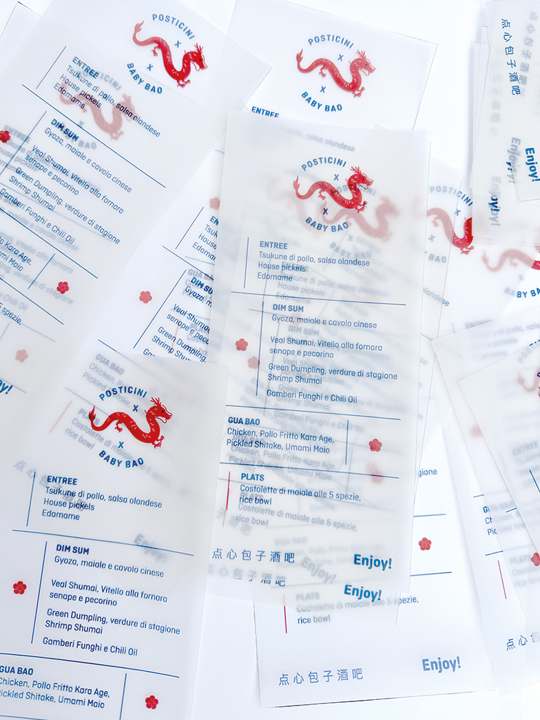 I menĂ¹ sono realizzati su carta vellum, per ricordare la carta di riso. Abbiamo anche realizzato una piccola illustrazione per il logo dell'evento!