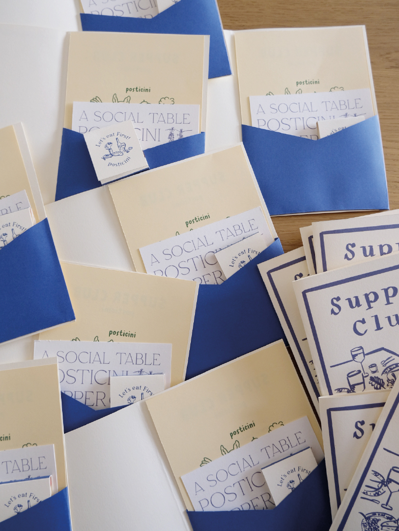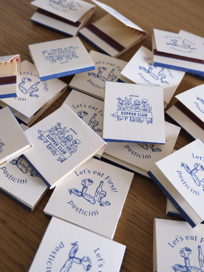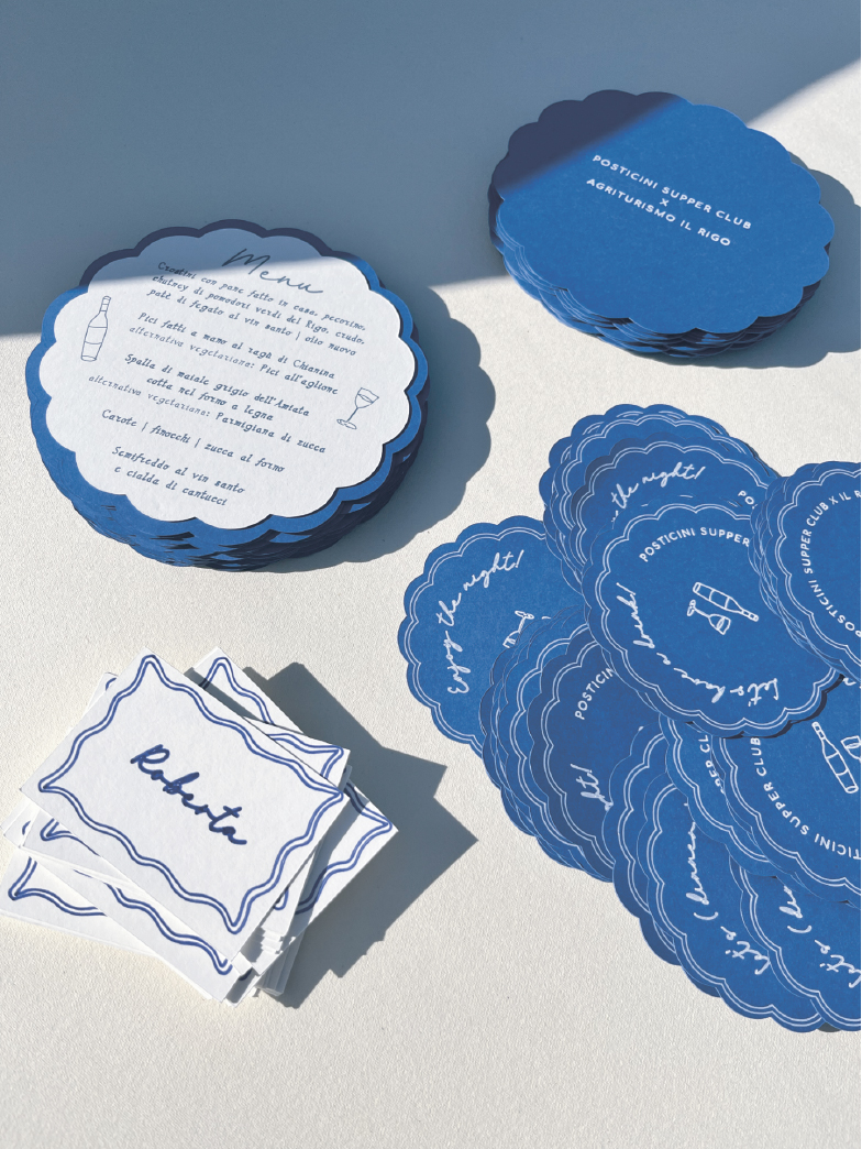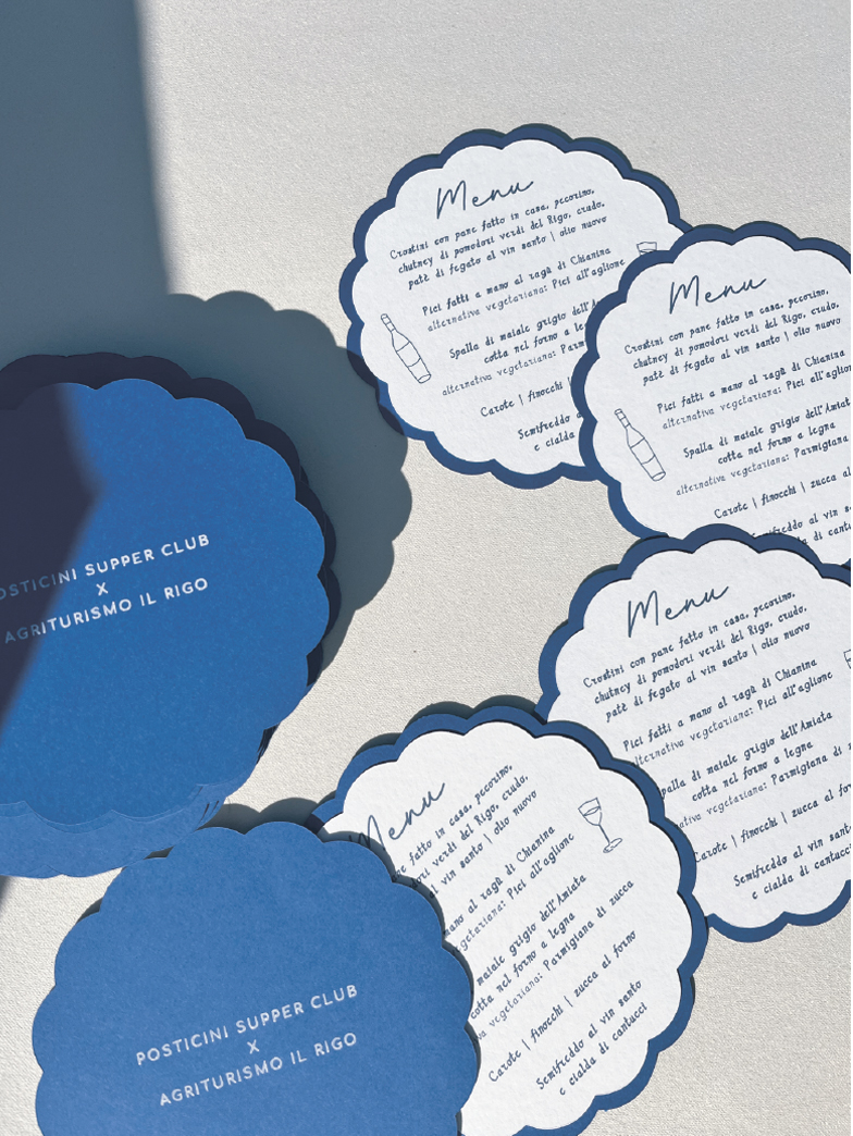 Illustrazioni realizzate a mano, menu blu e scallopped hanno colorato la tavolata di Posticini Supper Club al Rigo. I partecipanti all'evento hanno ricevuto al check in un folder di benvenuto, con locandina dell'evento, fiammiferi e uno schedule.