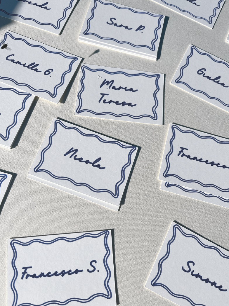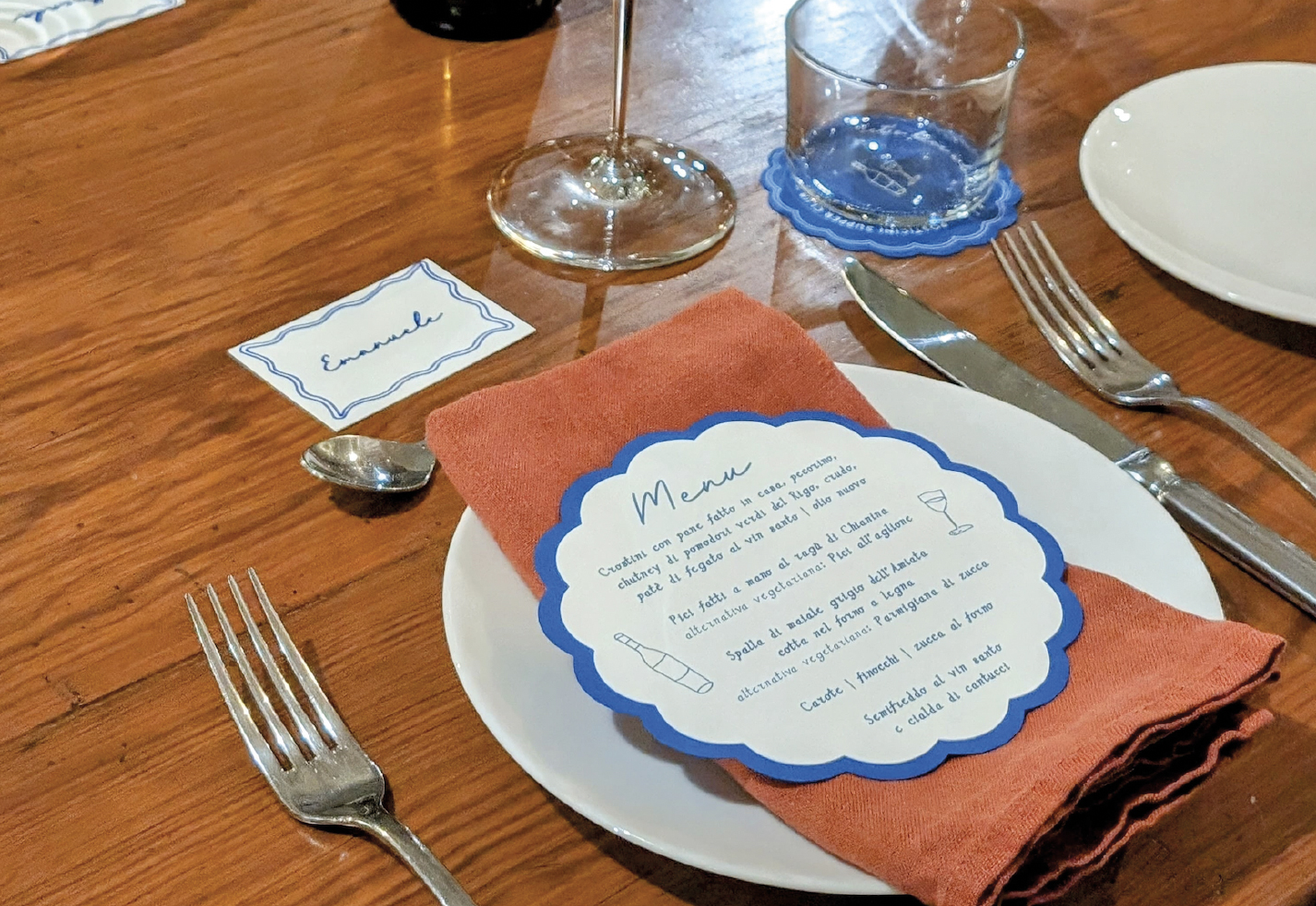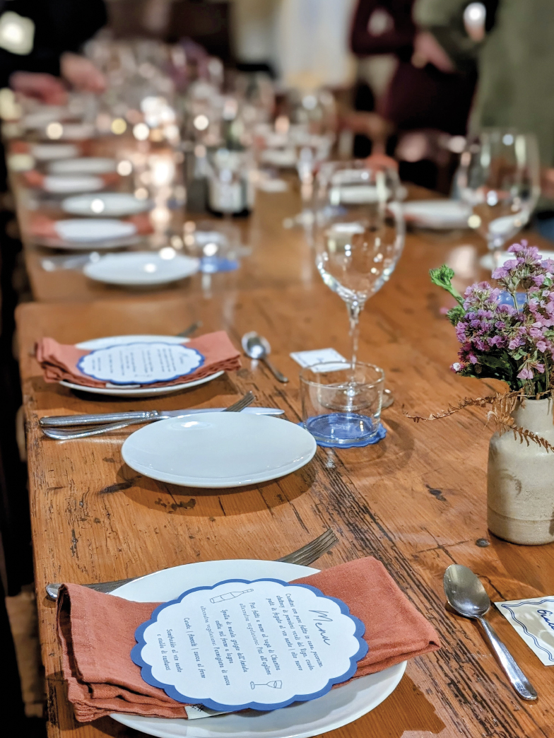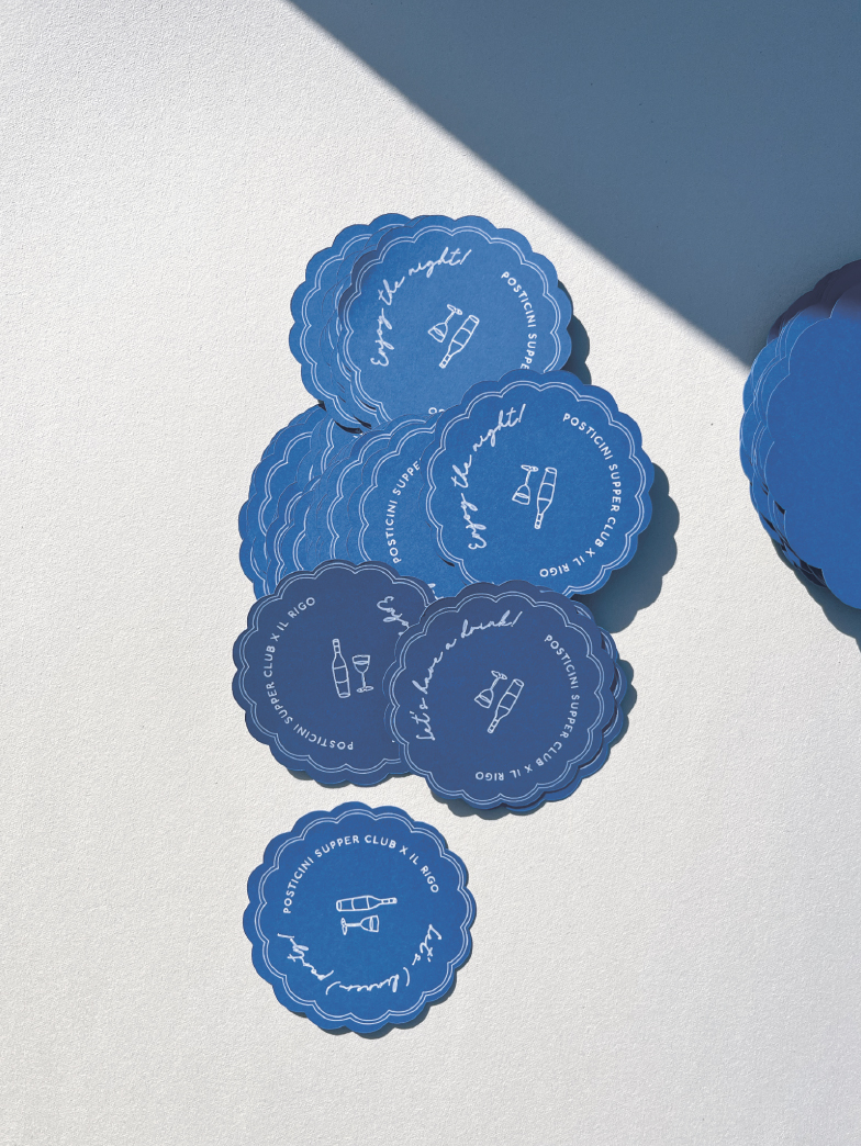 Illustrazioni realizzate a mano, menu blu e scallopped hanno colorato la tavolata di Posticini Supper Club al Rigo. I partecipanti all'evento hanno ricevuto al check in un folder di benvenuto, con locandina dell'evento, fiammiferi e uno schedule.