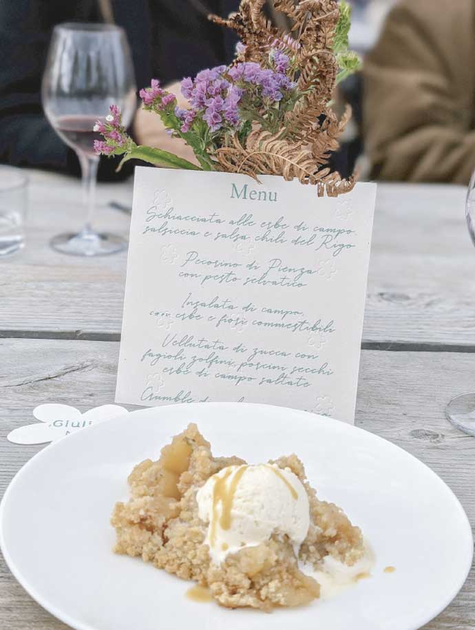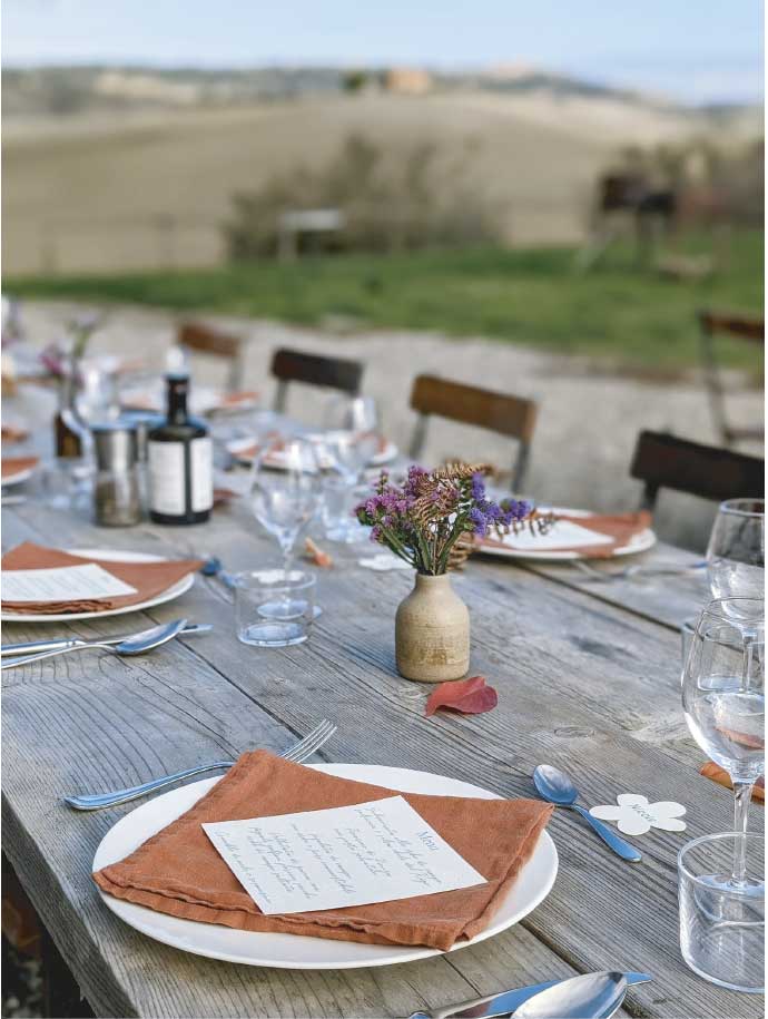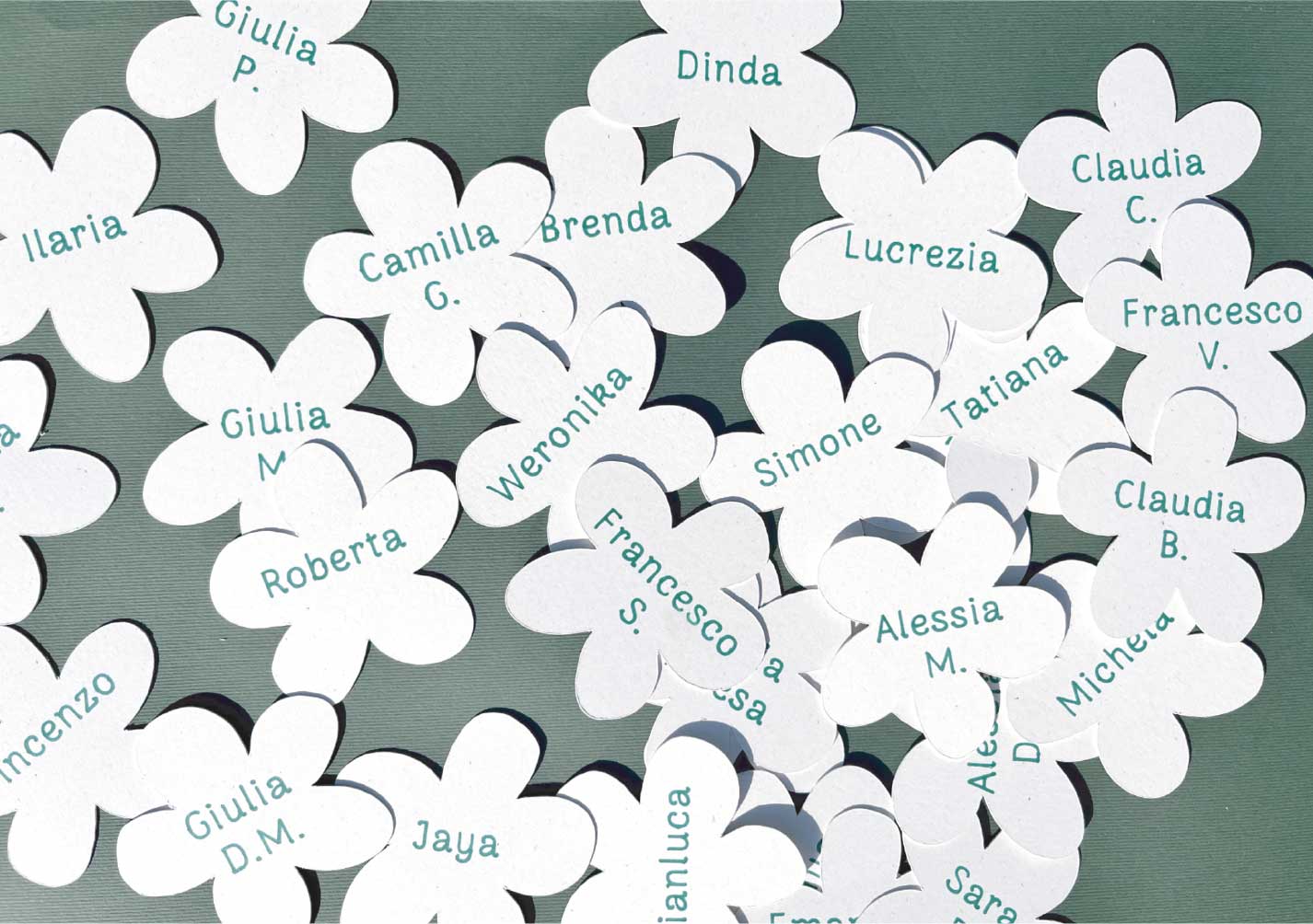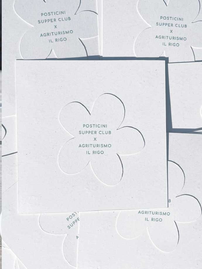 Per questo pranzo di Posticini, gli ospiti avrebbero partecipato ad una passeggiata nella natura della Toscana, raccogliendo erbe aromatiche e fiori. Abbiamo quindi seguito questo tema, sfruttando la figura del fiore in maniera geometrica.