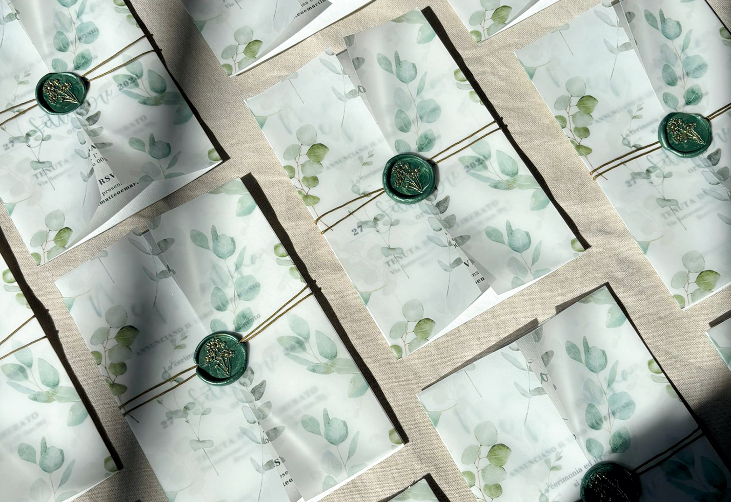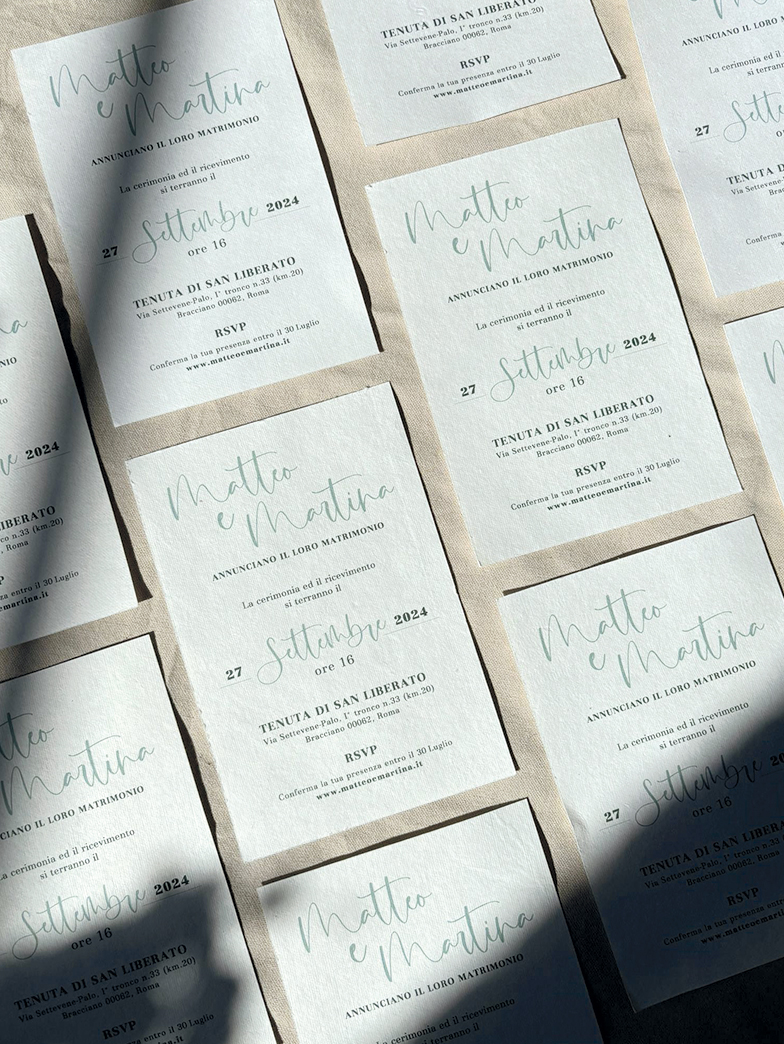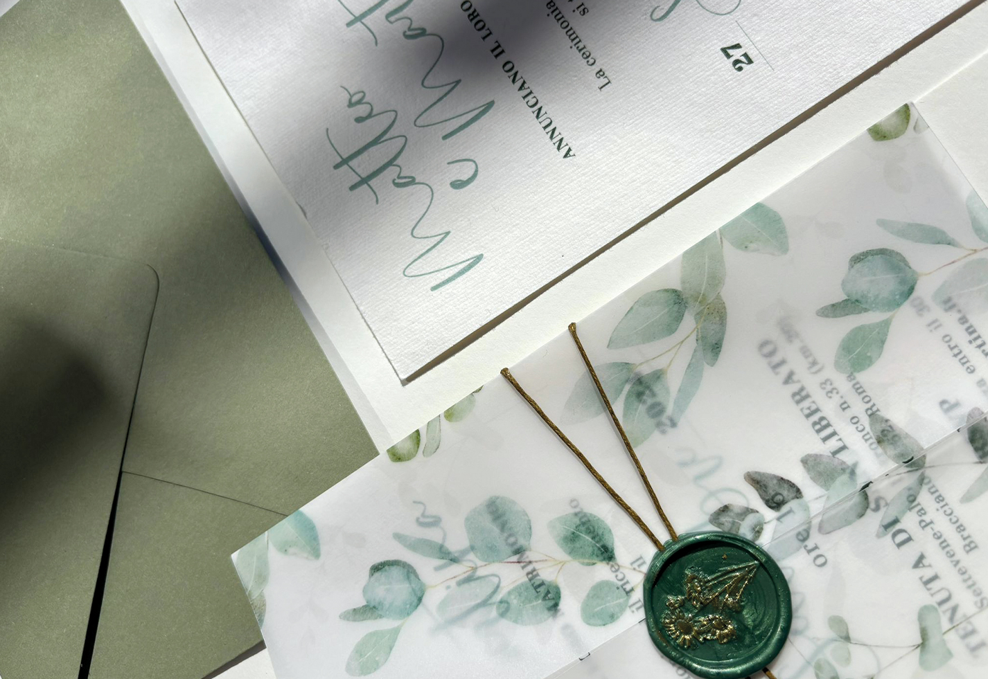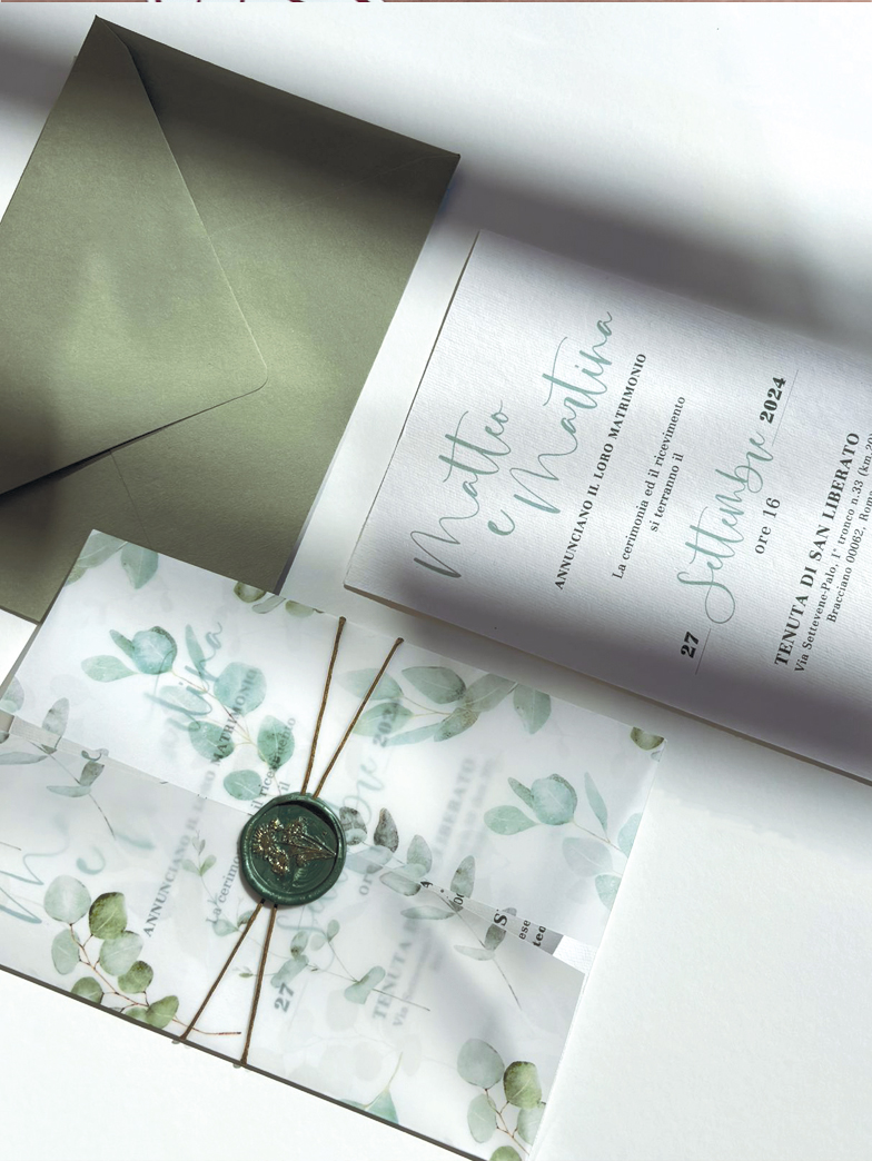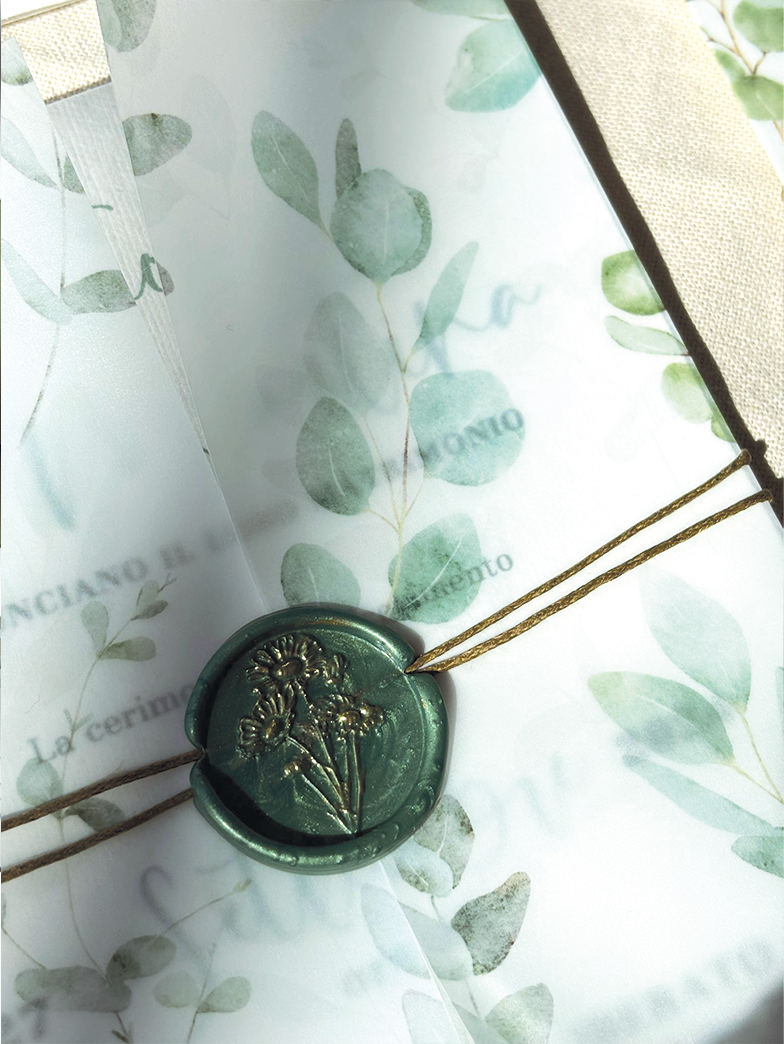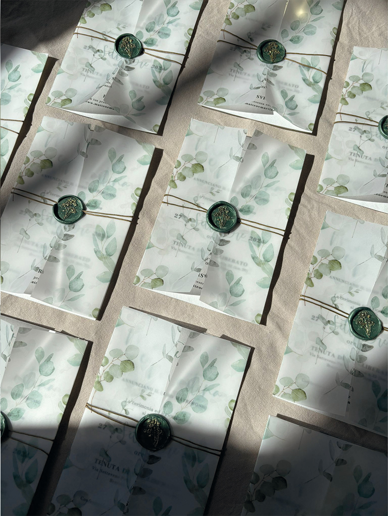 Queste partecipazioni sono realizzate in tecnica mista, con un'illustrazione ad acquerello stampata su una carta vellum, l'interno invece è realizzato su carta Amalfi. La chiusura della partecipazione è realizzata con uno spago fermato da una ceralacca realizzata a mano direttamente su ogni invito, poi dipinta d'oro.
